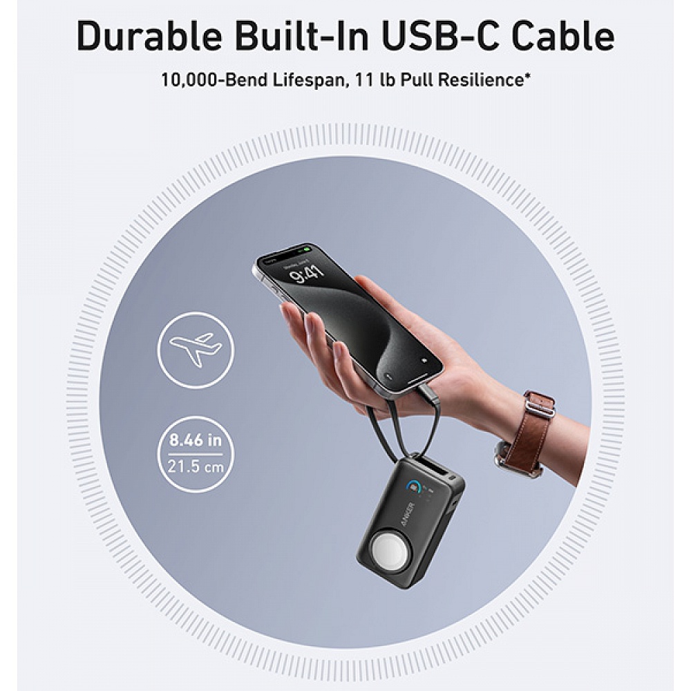 סוללה חיצונית Anker דגם A1657H11 MagGo Power Bank 10000mAh 35W בצבע שחור, עם קיבולת 10000mAh וסוללת ליתיום פולימר, הספק טעינה מירבי 35W עם טכנולוגיית USB-C PD, טעינה חוטית ואלחוטית ל-Apple Watch, כוללת יציאת USB-C וכבל USB-C מובנה, תמיכה בטעינה במקביל ל-2 מכשירים, מתאימה ל-iPhone, Apple Watch, Samsung, Google Pixel, Huawei, iPad, MacBook, Nintendo Switch ו-Steam Deck, משקל 245 גרם, כבל USB-C מובנה באורך 22 ס"מ, ואחריות לשנה.