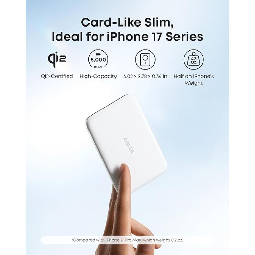 סוללה חיצונית Anker דגם A1665H21 MagGo Power Bank 5K Slim בצבע לבן, עם קיבולת 5000mAh, הספק טעינה מירבי 20W עם טכנולוגיות MagSafe Qi2 וטעינה מהירה, טעינה אלחוטית וחוטית, כוללת יציאת USB-C וטעינה אלחוטית, מתאימה ל-iPhone 12–17 ו-AirPods, מבנה מסגרת מתכת וגב פלסטיק, משקל 122 גרם, כוללת כבל USB-C, ואחריות ל-2 שנים.