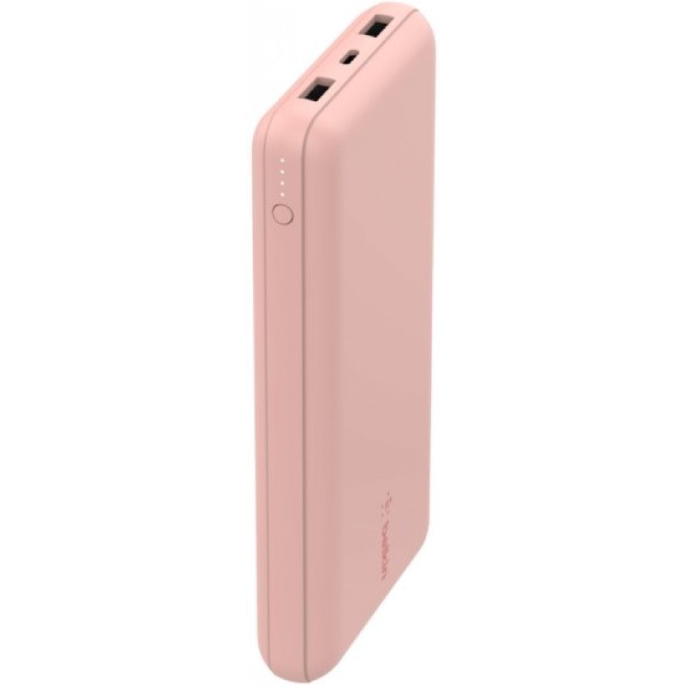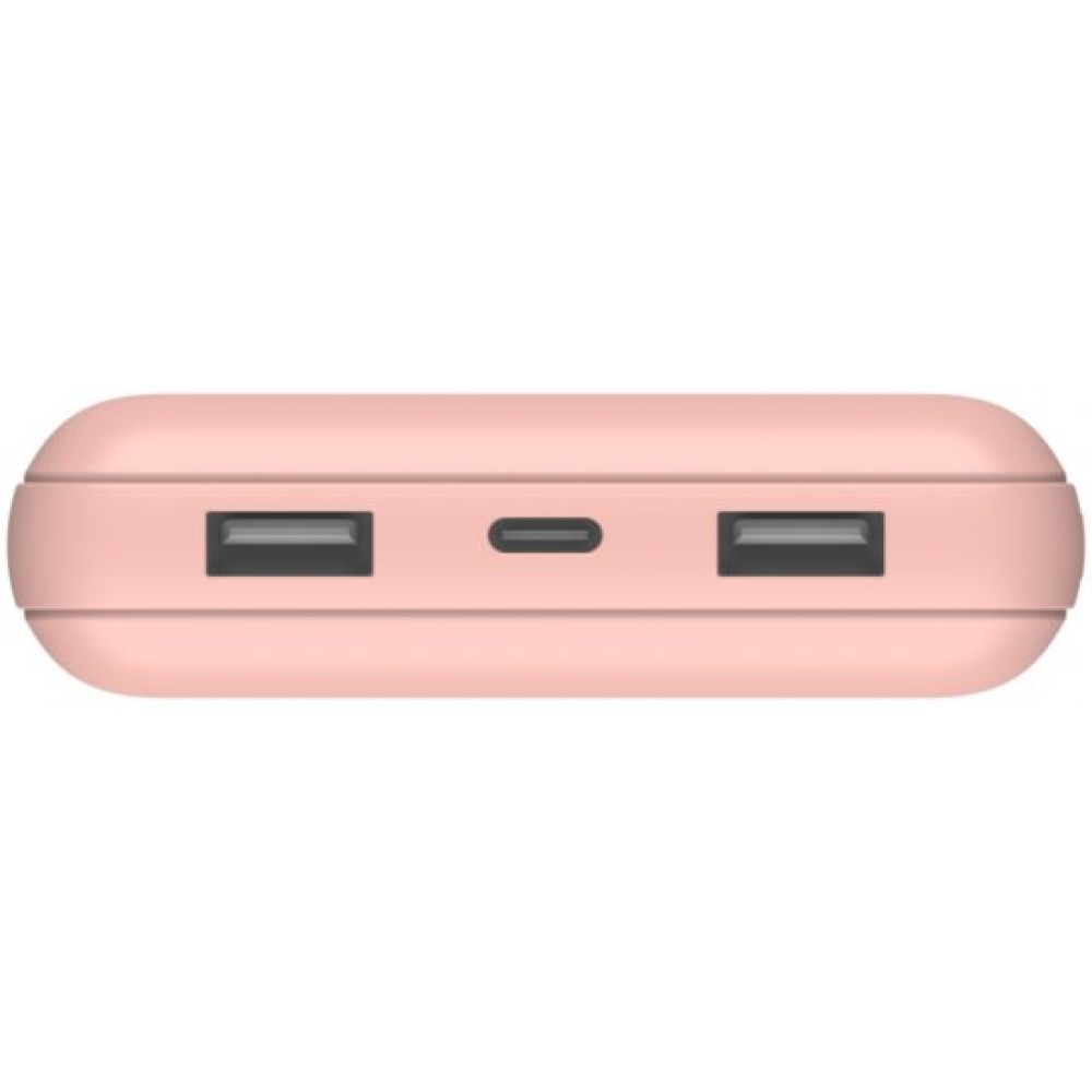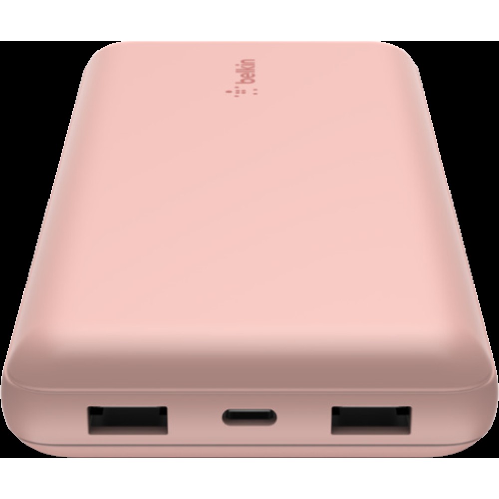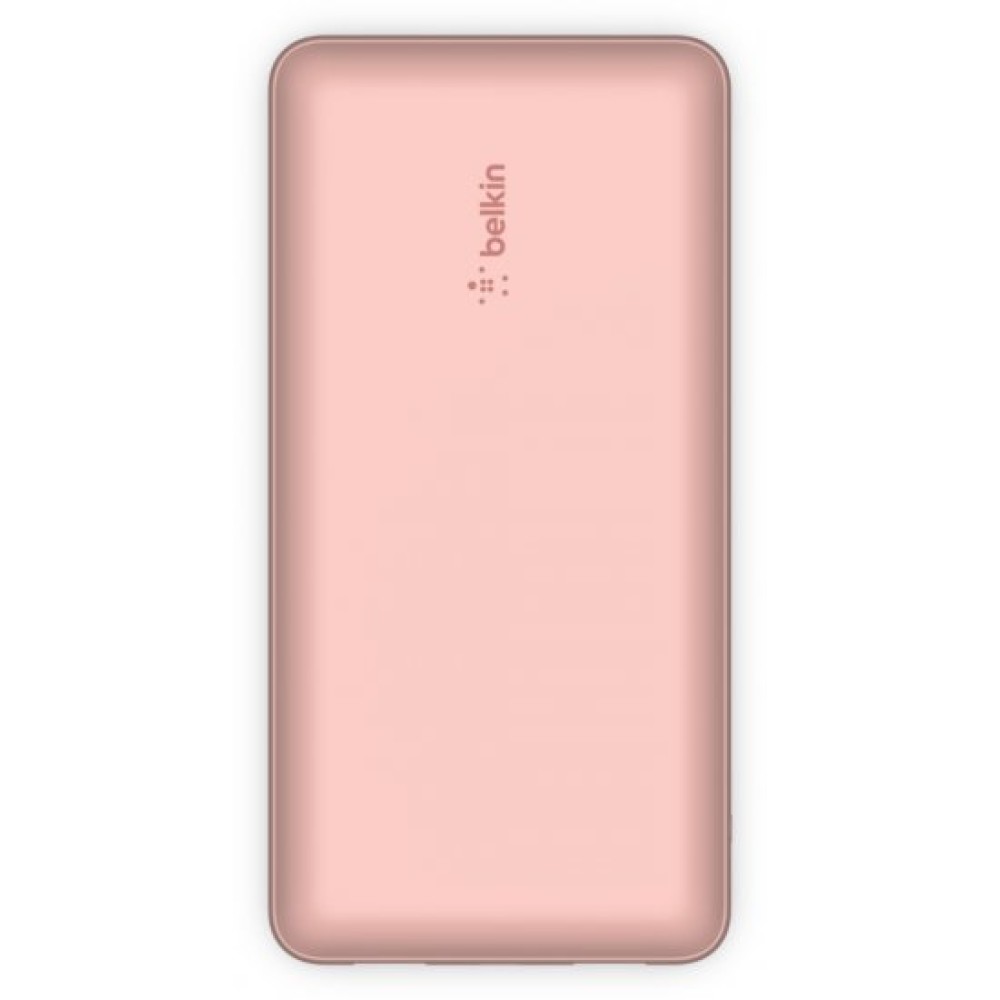 Belkin portable power bank model Boost Charge BPB012btRG in Rose Gold color, featuring a capacity of 20,000mAh and the ability to charge up to three devices simultaneously via 2xUSB-A and USB-C ports. Supports a maximum charging power of 15W, includes an LED indicator for charging status, and comes with a 15cm USB-A to USB-C cable. One-year warranty provided by the official importer Beconnect.