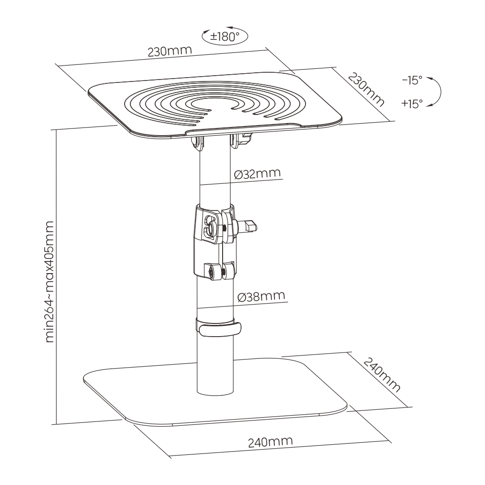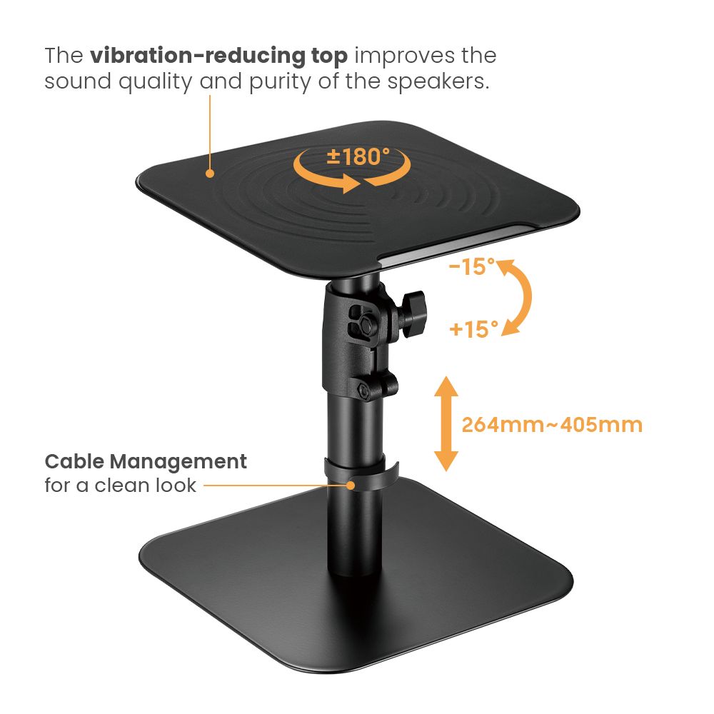 Desktop speaker stands (pair) by Lumi, model BS-69T, in Matte Black color. Made of steel, plastic, and silicone, featuring a powder-coated finish. Designed for freestanding installation on a desk, offering a fully adjustable structure with height range of 264–405 mm, rotation of ±180°, and tilt of ±15°. Includes an internal cable management channel and silicone pads to reduce vibration and enhance stability. Base dimensions: 240×240 mm, with a load capacity of up to 15 kg per stand. Compatible with universal audio devices, enhancing sound experience for workstations or gaming setups. Features easy tool-free installation, no drilling required. Comes with a 12-month official importer warranty.