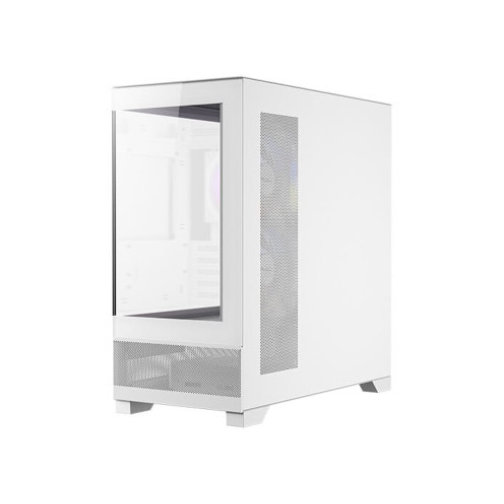 White Mini Tower case, compatible with Micro ATX and Mini ITX motherboards. The dimensions of the case are 210 mm width, 446 mm height, and 436 mm depth. The case features front ports for USB 2.0, USB 3.2, and an Earphone/Mic input. It supports the installation of up to 2 hard drives of 3.5 inches and 2 drives of 2.5 inches. The maximum CPU cooler height is 165 mm. The thermal design includes 3 pre-installed 120 mm ARGB fans, ensuring optimal airflow.