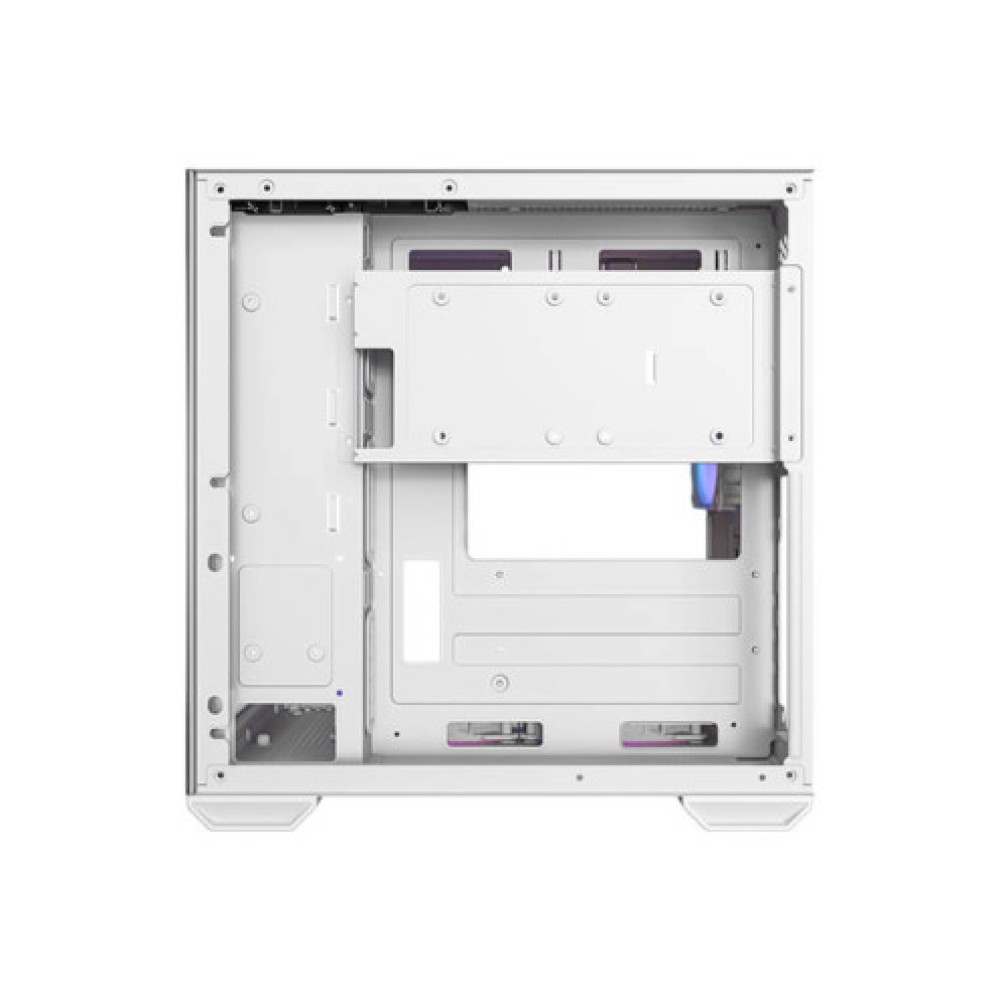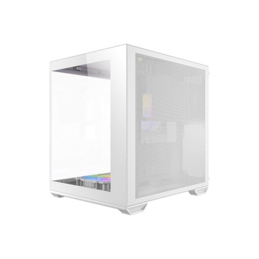 White Mini Tower case suitable for Micro ATX and Mini ITX motherboards. The dimensions of the case are 275 mm width, 354 mm height, and 346 mm depth. The case includes front ports for Earphone/Mic, USB Type-C, and USB 3.2, and offers ARGB lighting to enhance the design. It supports the installation of one 3.5-inch hard drive and three 2.5-inch drives. The maximum CPU cooler height is 165 mm, allowing flexibility in choosing advanced cooling solutions.