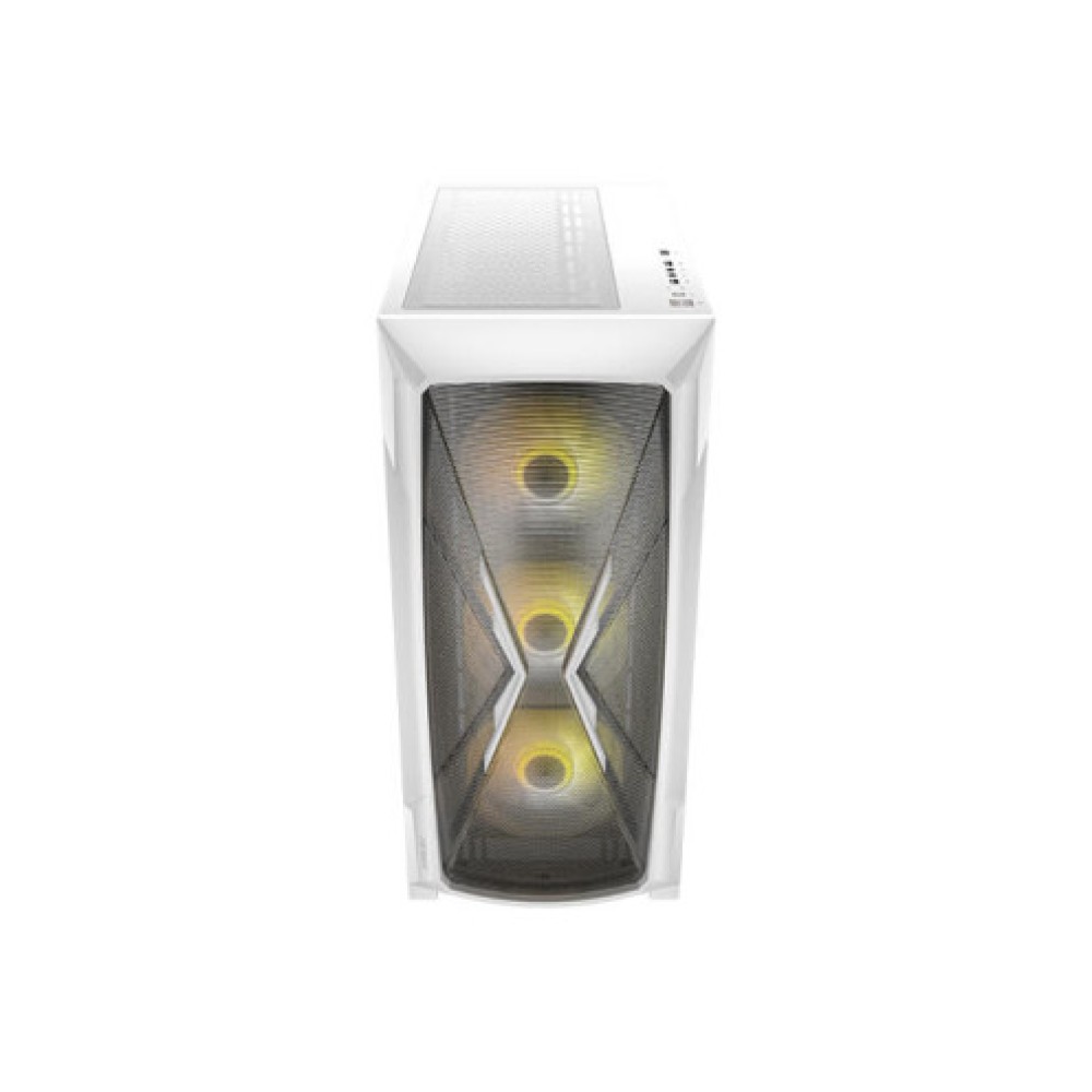 White Mid Tower case, supports motherboards of type ATX, Micro ATX, E-ATX, and Mini ITX. The dimensions of the case are 220 mm width, 490 mm height, and 481 mm depth. It includes front USB 3.0 ports, Earphone/Mic connection, USB Type-C, and RGB Controller. The case is equipped with ARGB lighting and allows installation of up to 2 Hard Drive bays of 3.5 inches and 4 bays of 2.5 inches (2+2). The maximum CPU cooler height is 170 mm, and the thermal design includes 3 120 mm fans with ARGB lighting at the front. The maximum allowable length for the graphics card is 375 mm.