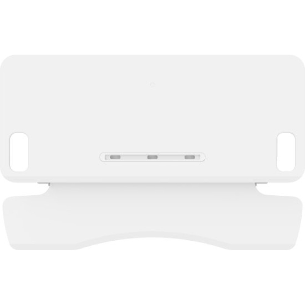 Adjustable desktop stand by LUMI, model DWS28-02N, in white color, featuring a gas-spring lifting mechanism with a height adjustment range of 110–505 mm. Includes a quick-adjust handle, a keyboard tray for improved comfort, and a durable 950×400 mm work surface with a 15 mm thickness, compliant with TSCA Title VI standard. The stand features a low-profile design with a spacious work area, supports up to 15 kg load capacity, and is suitable as a tabletop workstation.