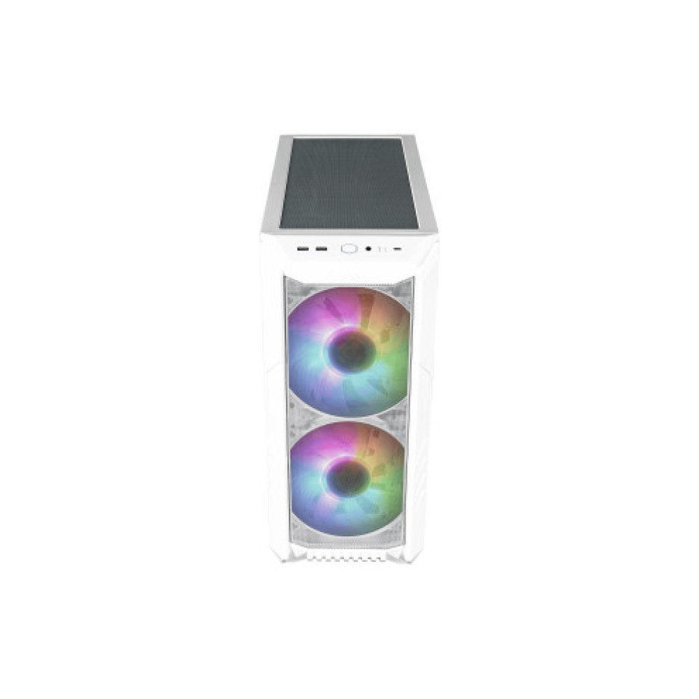 Mid Tower case in white color, compatible with ATX, Micro ATX, E-ATX, Mini ITX, and SSI-CEB motherboards. The dimensions of the case are 224 mm width, 510 mm height, and 516 mm depth. It includes front ports for Earphone/Mic, USB Type-C, RGB Controller, and USB 3.2. The case is equipped with ARGB lighting, supports two 3.5-inch drives and two 2.5-inch drives. The maximum height for CPU cooling is 165 mm. Advanced thermal design includes ARGB fans with two 200 mm fans at the front, one 120 mm rear fan, and one 120 mm fan on the drive cage.
