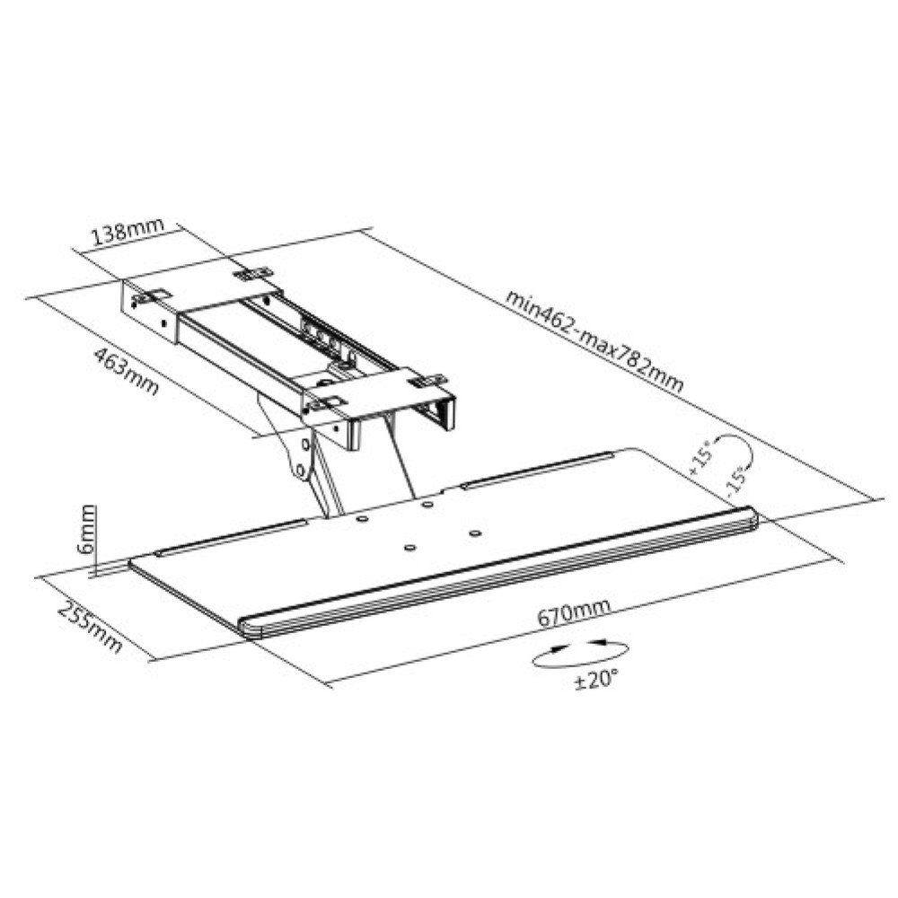 Under-desk keyboard tray with gel wrist rest KBT-02 by Lumi in matte black color, standard grade product, made of steel, plastic, and particle board with powder coating finish, rail-mounted installation under the desk, tray dimensions 670x255 mm, overall width 670 mm and depth 782 mm, height adjustment range 170 mm, tilt +15°~-15° and swivel +20°~-20°, sliding travel distance 320 mm, maximum load capacity 2 kg, includes adjustable platform, smooth sliding mechanism, and gel wrist support.