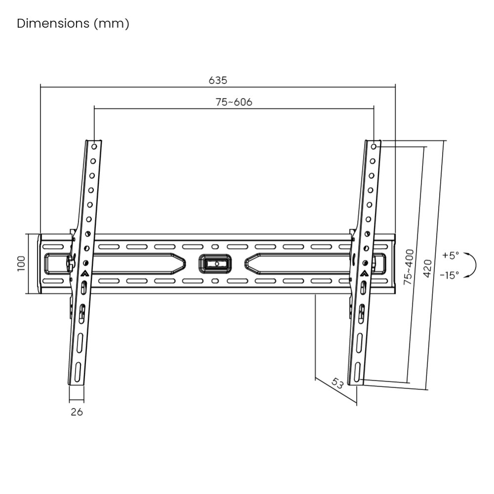 Tilt TV Wall Mount in Fine Texture Black color, suitable for 37″–86″ screens including curved TVs. Made of steel. Supports VESA 75x75, 100x100, 100x150, 150x100, 100x200, 200x100, 150x150, 200x200, 200x300, 300x200, 200x400, 400x200, 300x300, 300x400, 400x300, 600x200, 500x300, 400x400, 600x300, 500x400, 600x400 (maximum 606x400). Features a tilt mechanism with range +5°~-15°. Includes a detachable panel. Designed for installation on a solid wall or double stud (406mm/450mm/600mm) with a fixed wall plate. Wall distance 53 mm (2.1″). Maximum load capacity 45 kg (99 lbs). Arm dimensions 53x635x420 mm. 3-year warranty.