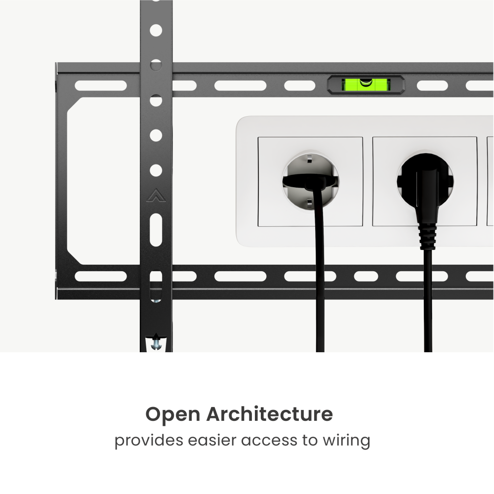 Fixed wall mount for TV, suitable for screens sized 32"–75", supports curved displays, color Fine Texture Black, made of steel. VESA standard 50x50–400x400. Equipped with a fixed mechanism with a built-in level for screen alignment, ultra-slim design with a detachable panel. Installation on Solid Wall or Double Stud (406 mm) with a fixed wall plate. Distance from the wall — 22 mm, maximum load capacity — 45 kg.