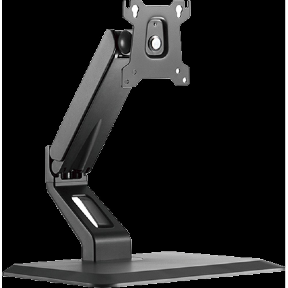 Freestanding Touch Screen Monitor Stand in Matte Black, designed for a single monitor sized 17″–32″, and compatible with VESA 75×75 and 100×100. Features a height adjustment range of 75–325 mm, 180° rotation, ±90° tilt, ±40° swivel, and support for portrait and landscape orientations. Includes cable management and free-adjustment movement with a gas-spring mechanism, and is intended for freestanding desktop installation (no desk mount required). Maximum load capacity is 10 kg, maximum arm extension is 263 mm, and overall dimensions are 325×306×382 mm. Comes with a 3-year warranty.