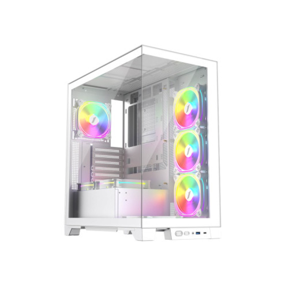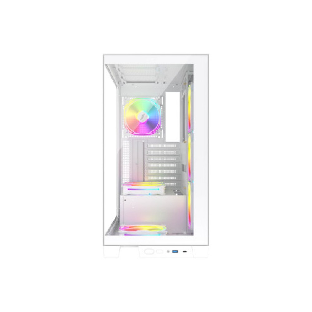 White Mid Tower case, supports ATX, Micro ATX, and Mini ITX motherboards. The dimensions of the case are 245 mm width, 475 mm height, and 450 mm depth. It includes front USB 3.0 ports, Earphone/Mic connection, and USB Type-C. The case is equipped with ARGB lighting, with space for two 3.5-inch Hard Drives and one 2.5-inch drive. The maximum CPU cooler height is 180 mm, and the maximum graphics card length is 425 mm.