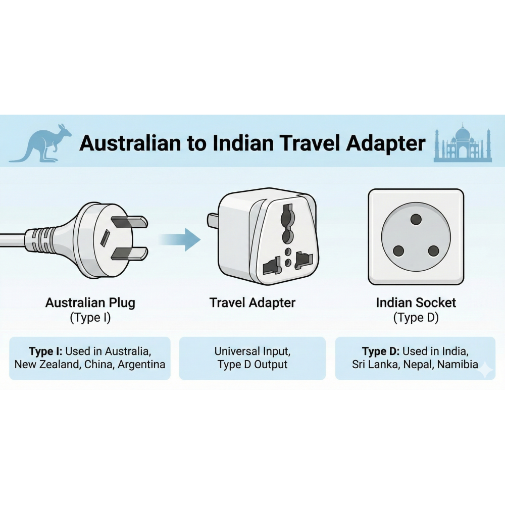 This travel adapter converts Type I plugs (flat angled pins) to the Indian 3-pin socket (Type D). Provides a safe and secure connection for chargers, smartphones, and laptops.