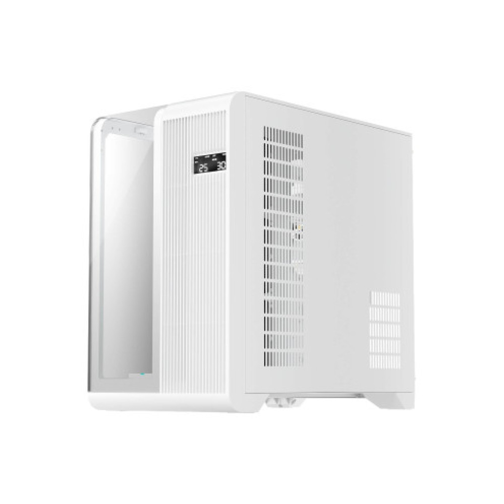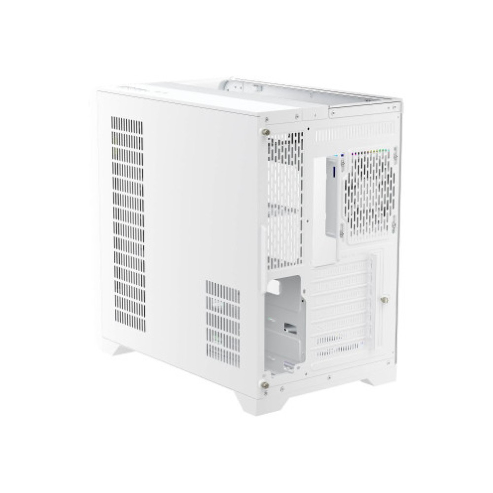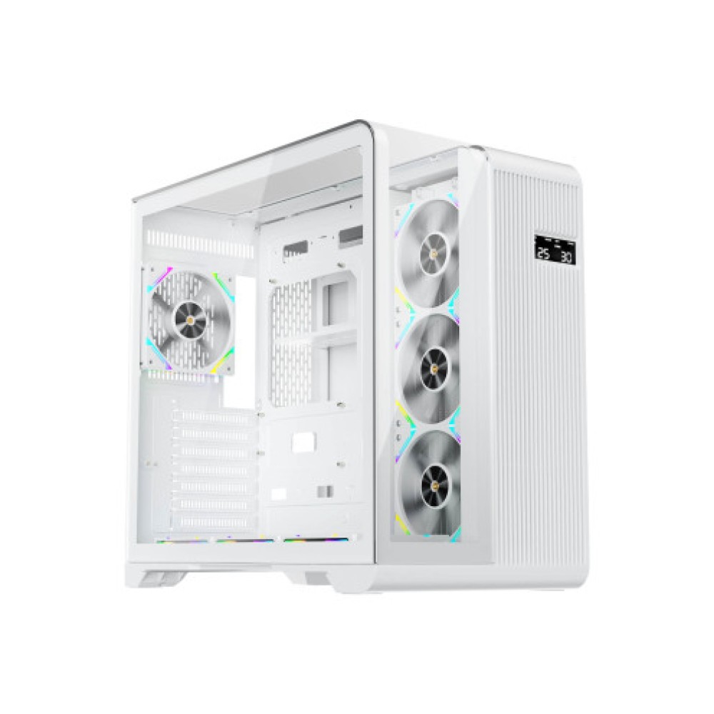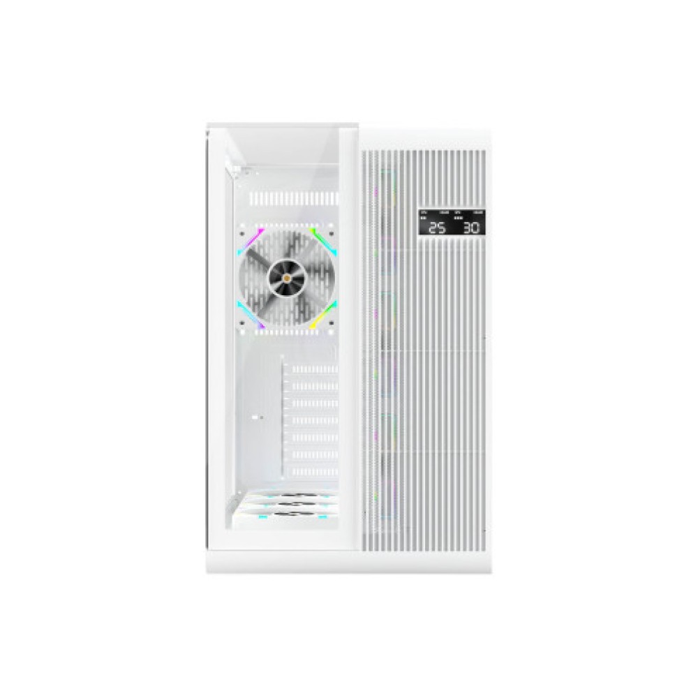 Mid Tower case in white color, supports ATX, Micro ATX, and Mini ITX motherboards, with dimensions of 280 mm width, 440 mm height, and 443 mm depth. The case is equipped with front ports including USB 3.0, Earphone/Mic connection, USB Type-C, and FAN Controller. ARGB lighting adds an aesthetic touch, while the case supports two 3.5-inch drives and three 2.5-inch drives. The maximum CPU cooler height is 155 mm, and the thermal design allows for the installation of up to 7 fans. The maximum graphics card length is 400 mm, ensuring compatibility with advanced components.