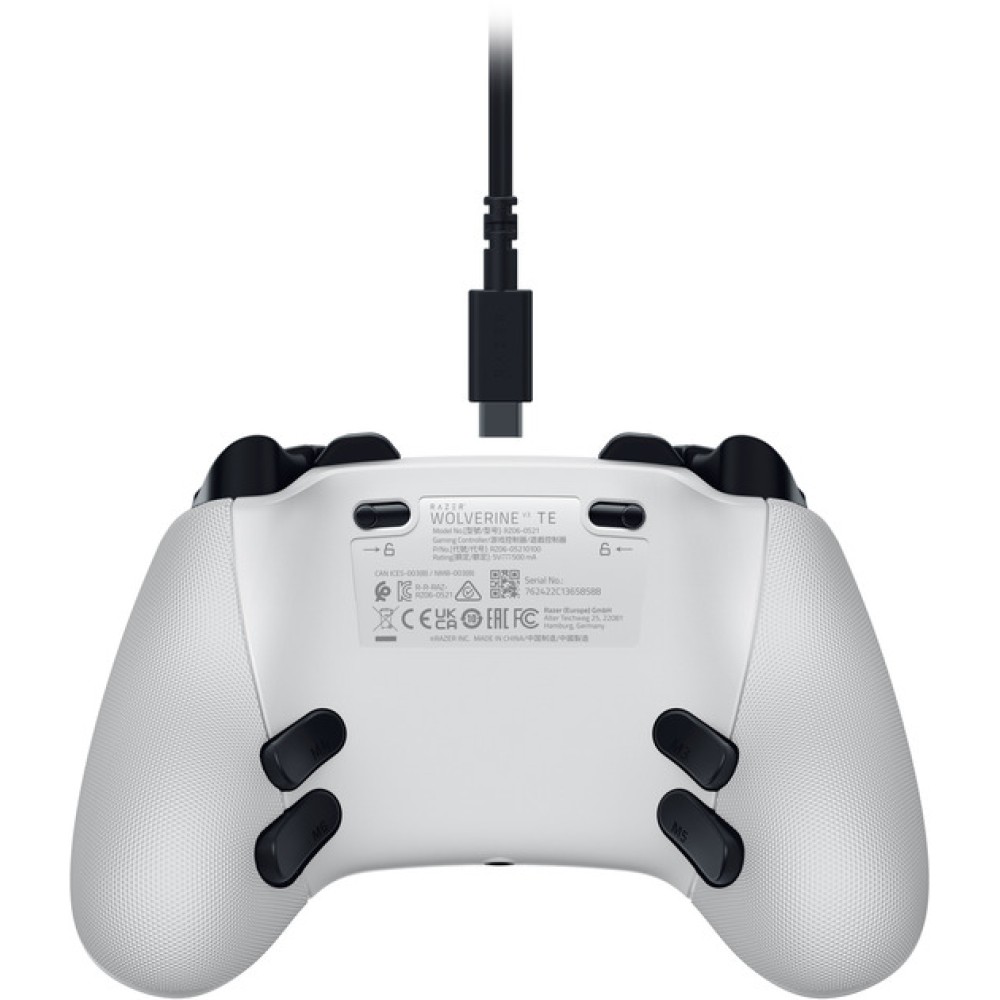 Wired gamepad Razer Wolverine V3 Tournament Edition in white, compatible with Xbox Series X|S and PC. Features USB Type-C connectivity with a 3-meter cable and operates via USB power. The controller includes 4 rear paddles, 2 bumpers, a Trigger Lock mechanism, mechanical buttons, analog sticks with Hall sensors, and a tournament mode with a 1000Hz polling rate. Supports the Razer Controller App for personalized configuration. Includes 24-month warranty provided by Razer.
