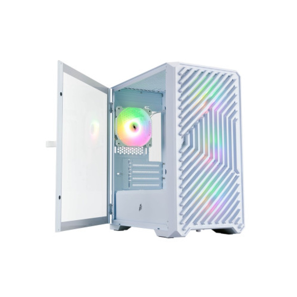 White Mini Tower case, supports Micro ATX and Mini ITX motherboards. The dimensions of the case are 210 mm width, 422 mm height, and 377 mm depth. The case is equipped with front USB 2.0 and USB 3.0 ports, as well as a headphone/microphone input. ARGB lighting adds an aesthetic touch, while the thermal design includes ARGB fans with three 120 mm fans at the front and one 120 mm fan at the back. The case supports two 3.5-inch drives and an additional 2.5-inch drive, with the option for one more 2.5-inch drive. The maximum CPU cooler height is 165 mm, and the maximum graphics card length is 330 mm.