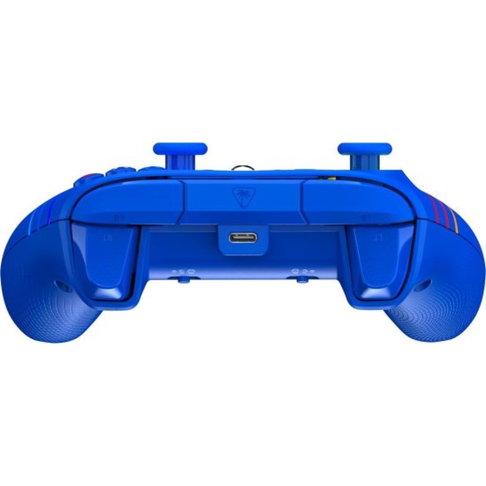 Turtle Beach Afterglow Wave gaming controller in blue, featuring RGB lighting with 8 zones and 8 built-in lighting modes. Compatible with Xbox Series X|S, Xbox One, and Windows 10/11. Includes voice controls for volume, game/chat balance, and microphone mute. Equipped with dual rumble motors, two mappable quick-action buttons, and adjustable Hall-Effect triggers with three stop-positions. Designed with an ergonomic shape and textured grip for maximum comfort. Includes a one-year warranty by the official importer.