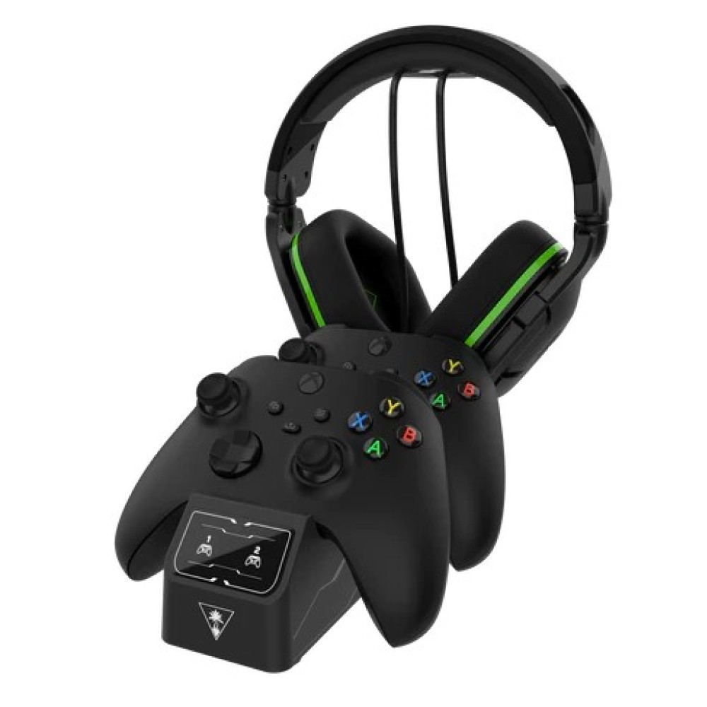Controller charging station by Turtle Beach, model Fuel Dual Controller Charging Station, in black. Compatible with Xbox Series X/S and Xbox One. Features contact charging with LED indicators, two batteries providing up to 22 hours of use each, and a full charging time of 2.5 hours. Includes USB-C connectors and a separate stand for headphones (without charging functionality). One-year warranty.