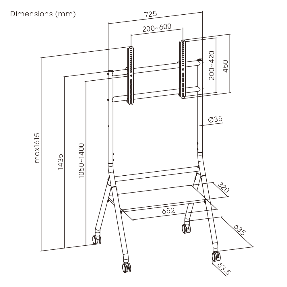 | Dimensions725x635x1615mm (28.5"x25"x63.6") | FinishPowder Coating | Screen Compatibility37"-86" |