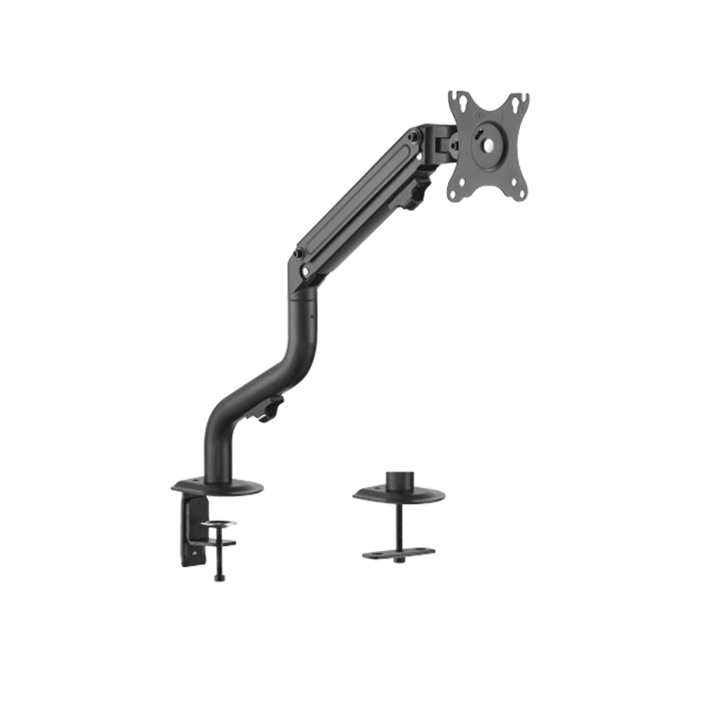 זרוע קפיץ מכנית למוניטור יחיד (Pipe-Shaped Counterbalance Spring-Assisted Monitor Arm) בצבע Fine Texture Black, מתאימה למסך אחד בגודל 17" עד 32", תואמת לתקן VESA 75x75 ו-100x100, עם כיוון גובה באמצעות מנגנון קפיץ נגד משקל, סיבוב 180°, הטייה של +90° עד -45°, סיבוב צידי של ±90°, תמיכה במצב אנכי ואופקי, ניהול כבלים פנימי וכוונון חופשי. מתאימה להתקנה שולחנית עם קלמפ או גומט, לעובי שולחן של 10–80 מ"מ (קלמפ) או 10–40 מ"מ (גומט). עומס מקסימלי של 8 ק"ג, אורך זרוע מקסימלי 458 מ"מ, מידות המתקן 117×512×606 מ"מ, ואחריות לשלוש שנים.