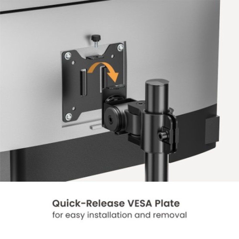 זרוע למסך יחיד (Articulating Monitor Arm) בצבע Matte Black, מתאימה למסך אחד בגודל 17" עד 49", תואמת לתקן VESA 75x75 ו-100x100, עם כיוון גובה, סיבוב 180°, הטייה של +50° עד -20°, סיבוב צידי של ±90°, תמיכה במצב אנכי ואופקי, ניהול כבלים, כוונון חופשי והתקנה מהירה באמצעות לוחית VESA מתפרקת. מתאימה להתקנה שולחנית עם קלמפ או גומט, לעובי שולחן של 10–85 מ"מ (קלמפ) או 10–75 מ"מ (גומט). גובה העמוד 409 מ"מ, עומס מקסימלי של 20 ק"ג, אורך זרוע מקסימלי 574 מ"מ, מידות המתקן 116×167×574 מ"מ, ואחריות לשלוש שנים.