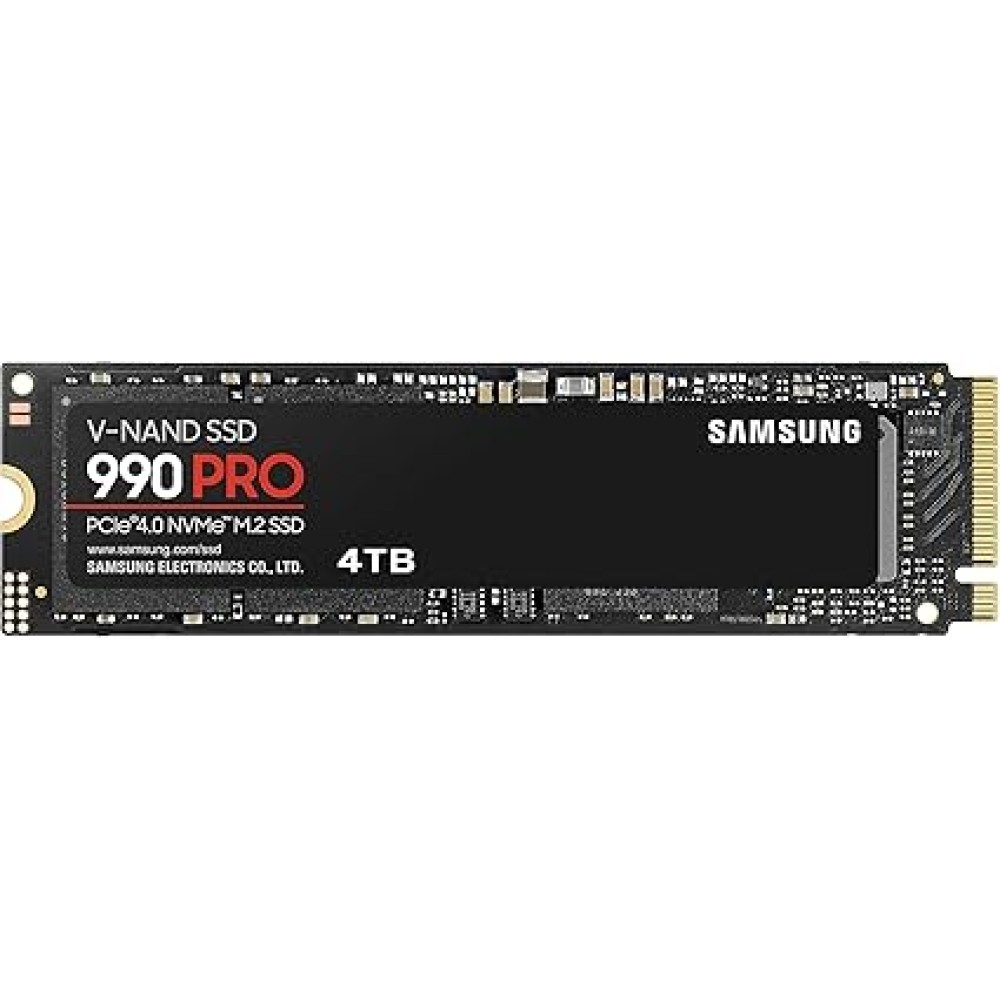 כונן SSD פנימי Samsung מסדרת 990 PRO דגם MZ-V9P4T0B בנפח 4TB, מסוג NVMe SSD בממשק PCIe 4.0 x4 NVMe 2.0 ובפורמט M.2 2280, עם מהירות קריאה עד 7450MB/s ומהירות כתיבה עד 6900MB/s, ואחריות מוגבלת לחמש שנים.