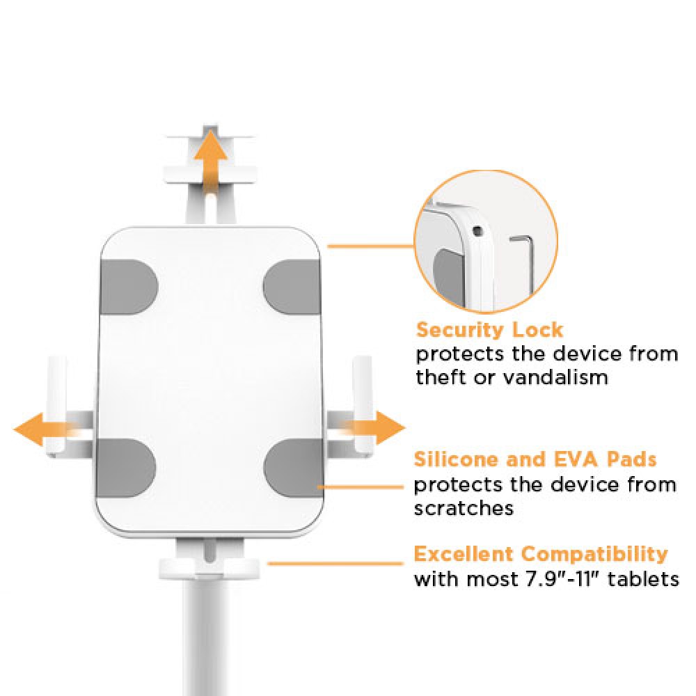 מתקן רצפתי קיוסק אנטי-תאנה לטאבלט בצבע Matte Black, תואם לרוב הטאבלטים בגודל 7.9"–11", עם כיוון גובה בין 79 ל-119 ס"מ, סיבוב 360°, הטייה של +20° עד -110°, כולל ניהול כבלים, כוונון חופשי, מצב אנכי/אופקי, ומנגנון שחרור מהיר. מתאים להתקנה חופשית או קיבוע לרצפה. עומס מקסימלי 1 ק"ג, מידות: 220×300×1325 מ"מ. אחריות לשלוש שנים.