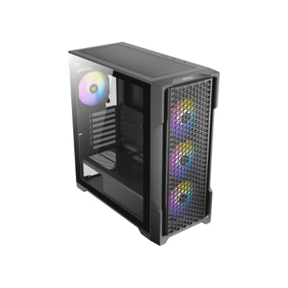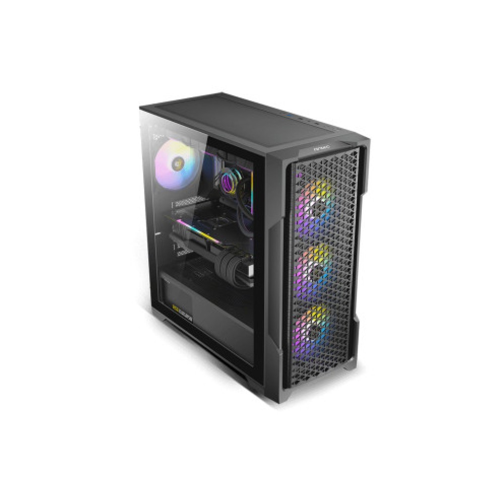 Корпус Mid Tower черного цвета, совместимый с материнскими платами ATX, Micro ATX и Mini ITX. Его размеры составляют 210 мм в ширину, 486 мм в высоту и 473 мм в глубину. Корпус оснащен передними портами USB 2.0, USB 3.0, разъемом для наушников/микрофона и RGB контроллером. Подсветка ARGB добавляет эстетический штрих, с возможностью установки до 2 жестких дисков размером 3.5 дюйма и 2+1 накопителей размером 2.5 дюйма. Максимальная высота для процессорного кулера составляет 160 мм. Термодизайн включает ARGB вентиляторы с 3 вентиляторами 120 мм спереди и 120 мм вентилятором сзади. Максимальная длина для видеокарты составляет 385 мм.