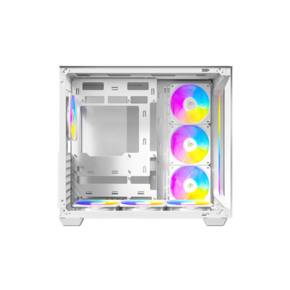 Корпус Mid Tower белого цвета, поддерживает материнские платы формата ATX, Micro ATX и Mini ITX. Размеры корпуса составляют 285 мм в ширину, 400 мм в высоту и 469 мм в глубину. Включает передние порты USB 3.0, Earphone/Mic, USB Type-C и RGB Controller. Подсветка ARGB добавляет впечатляющие визуальные эффекты. Корпус предлагает место для одного жесткого диска размером 3.5 дюйма и двух жестких дисков размером 2.5 дюйма. Максимальная высота для процессорного кулера составляет 160 мм. Тепловой дизайн включает вентиляторы PWM ARGB с тремя вентиляторами размером 120 мм в нижней части, тремя вентиляторами размером 120 мм с правой стороны и одним вентилятором размером 120 мм сзади. Максимальная длина для видеокарты составляет 410 мм.