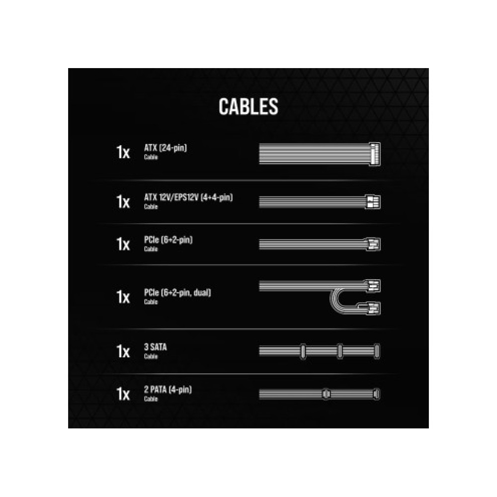 Блок питания ATX мощностью 750W с рейтингом эффективности 80+ Bronze, обеспечивающий высокую производительность и энергетическую эффективность. Блок питания включает 3 разъема SATA, 2 разъема Molex 4 pin, 3 разъема PCI-E 8 pin и один разъем EPS 12V 8 pin, что обеспечивает большую гибкость при подключении различных компонентов. Следует отметить, что данный блок питания поставляется без сетевого кабеля.
