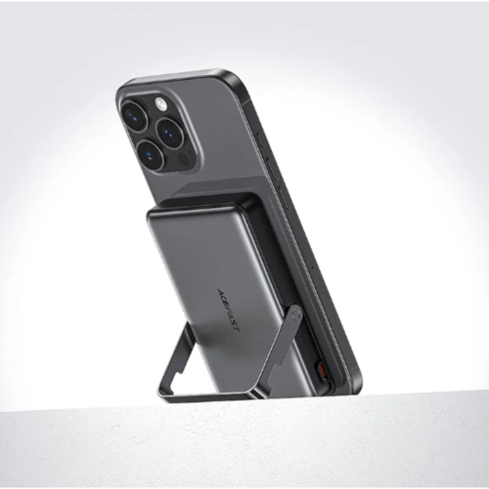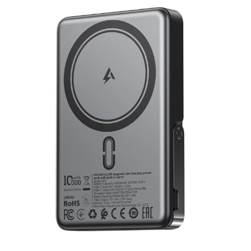 Магнитный беспроводной портативный аккумулятор ACEFAST M17 серии PWRup, чёрного цвета, ёмкостью 10000 мА·ч (номинальная 6000 мА·ч), с проводной зарядкой до 22,5 Вт и магнитной беспроводной зарядкой (Mag-Charge) до 15 Вт. Поддерживает современные технологии быстрой зарядки, включая PD 3.0, QC 3.0, AFC и другие. Оснащён портом USB-C, встроенной складной подставкой и LED-индикаторами уровня заряда и процесса зарядки. Изготовлен из огнестойкого PC-пластика и алюминиевого сплава, вес 198 г, в комплекте кабель USB-C – USB-C, гарантия 18 месяцев.