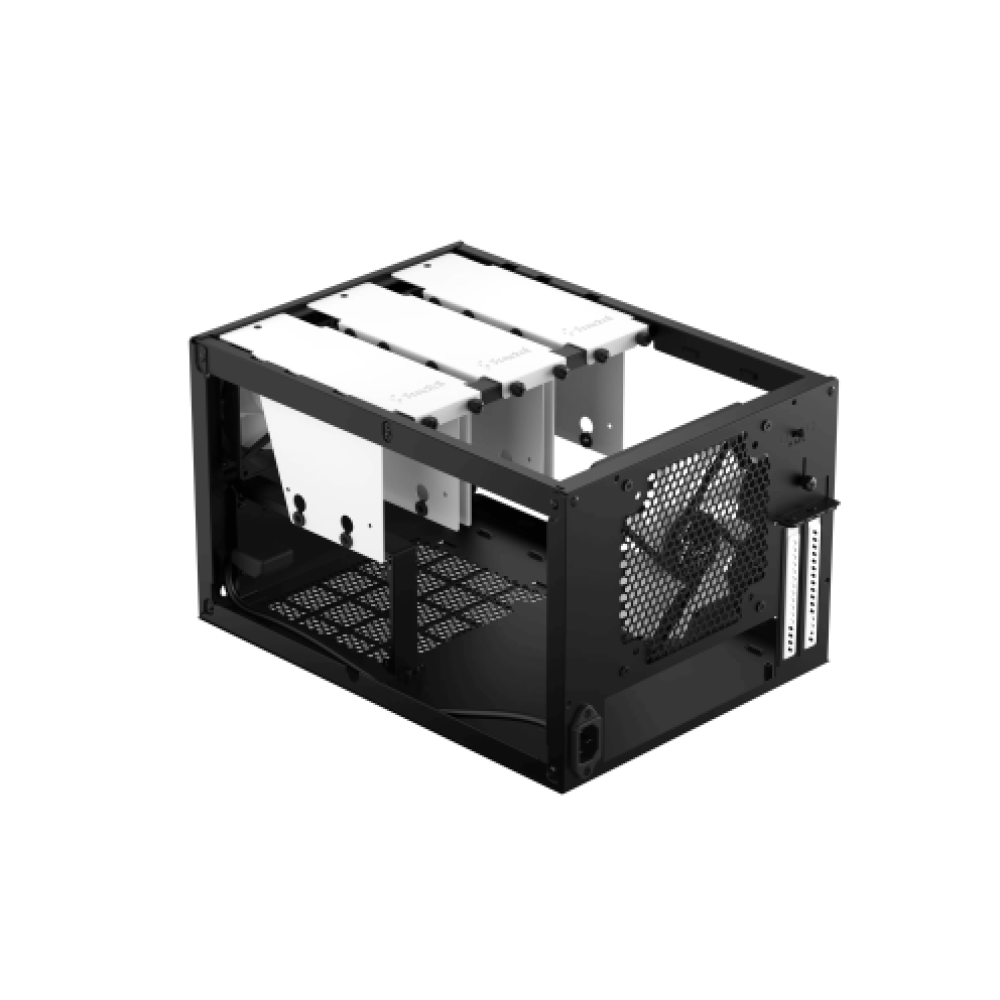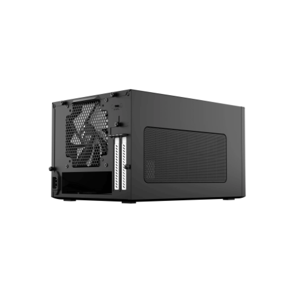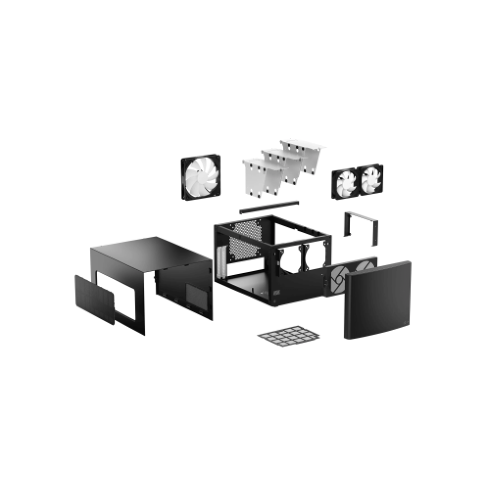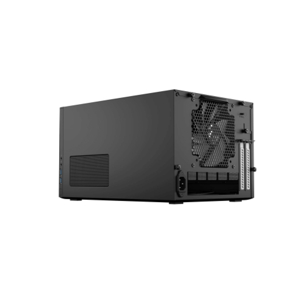 Корпус SFF черного цвета, совместим с материнскими платами Mini ITX и Mini DTX, размеры W=250 H=210 D=374 мм. Включает передние порты USB 3.0 и для наушников/микрофона. Поддерживает блок питания максимальной длиной 160 мм. Этот корпус позволяет установить до 6 жестких дисков размером 3.5 дюйма (или 2.5 дюйма) и 6 дисков размером 2.5 дюйма (или 3.5 дюйма). Максимальная высота для охлаждения процессора составляет 160 мм. Термальный дизайн включает два вентилятора спереди корпуса размером 92 мм и задний вентилятор размером 140 мм. Поддерживает максимальную длину графической карты 310 мм.