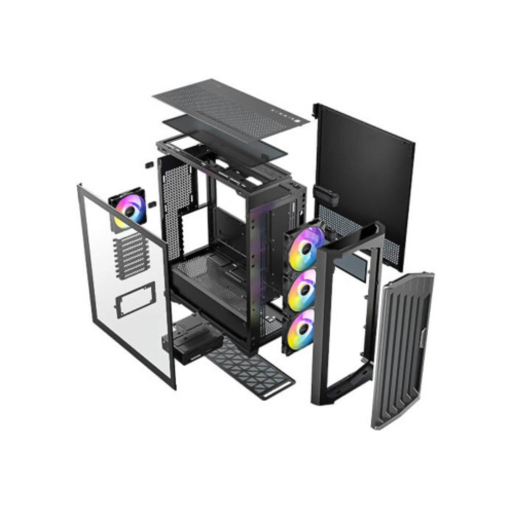 Корпус Full Tower черного цвета, предлагающий совместимость с материнскими платами ATX, Micro ATX, E-ATX и Mini ITX. Размеры корпуса составляют 230 мм в ширину, 522 мм в высоту и 522 мм в глубину. В корпусе имеются передние порты USB 3.0, разъем для наушников/микрофона и USB Type-C. Он поддерживает два жестких диска размером 3,5 дюйма и два дополнительных размера 2,5 дюйма. Максимальная высота охлаждения для процессора составляет 175 мм. Корпус включает в себя термический дизайн с тихими вентиляторами типа ARGB PWM, включая три вентилятора 140 мм спереди и вентилятор 120 мм сзади.