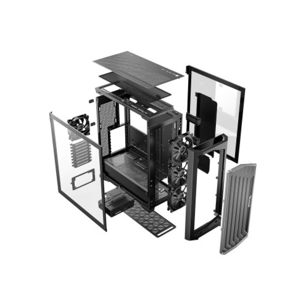 Корпус Full Tower черного цвета, совместимый с материнскими платами формата ATX, Micro ATX, E-ATX и Mini ITX. Размеры корпуса составляют 522 мм в глубину, 230 мм в ширину и 522 мм в высоту. Корпус оснащен передними выходами, включая разъемы Earphone/Mic, USB Type-C, контроллер вентиляторов и USB 3.2. Он поддерживает два жестких диска размером 3.5 дюйма и три накопителя размером 2.5 дюйма. Максимальная высота охлаждения для процессора составляет 170 мм, а его тепловой дизайн включает три вентилятора 140 мм спереди и вентилятор 120 мм сзади, что обеспечивает оптимальный поток воздуха.