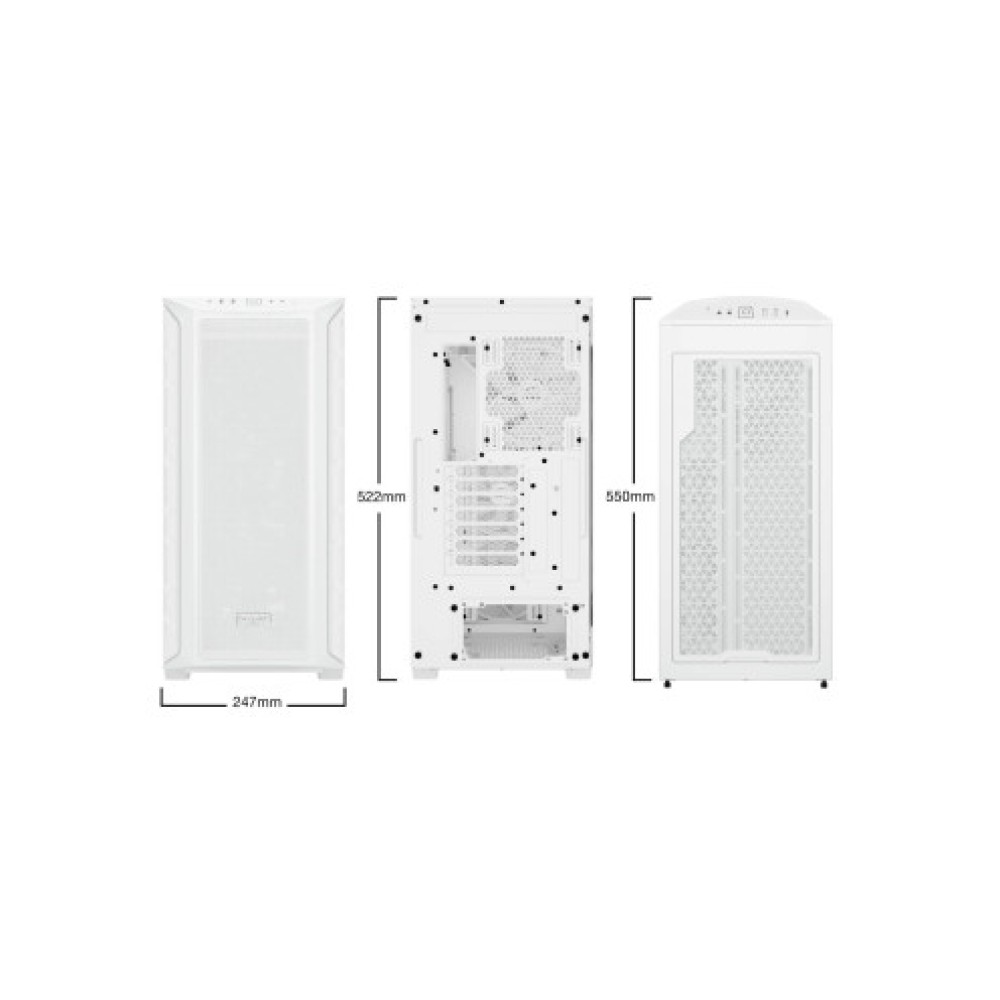 Корпус Mid Tower белого цвета, совместимый с материнскими платами ATX, Micro ATX, E-ATX и Mini ITX. Размеры корпуса составляют 247 мм в ширину, 522 мм в высоту и 550 мм в глубину. Включает передние выходы для наушников/микрофона, USB Type-C и USB 3.2. Корпус оснащен ARGB подсветкой и способен вмещать 1+2 накопителя 3.5 дюйма и 3+4 накопителя 2.5 дюйма. Максимальная высота для процессорного кулера составляет 180 мм. Продвинутый термический дизайн с установленными вентиляторами Light Wings White PWM: 3 вентилятора 140 мм спереди и 140 мм вентилятор сзади.