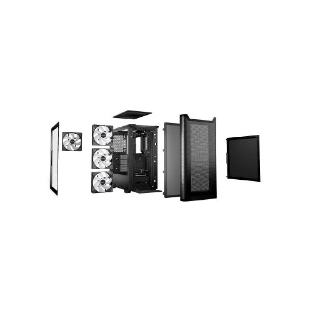 Корпус Mid Tower черного цвета, размеры 231 мм в ширину, 463 мм в высоту и 450 мм в глубину. Корпус оснащен передними выходами, включая разъемы для наушников/микрофона, USB Type-C и USB 3.2. Подсветка ARGB добавляет эстетический штрих системе. Корпус поддерживает два жестких диска размером 3,5 дюйма и пять накопителей размером 2,5 дюйма. Максимальная высота охлаждения для процессора составляет 175 мм, а продвинутый тепловой дизайн включает четыре предустановленных вентилятора Light Wings LX PWM, обеспечивающих оптимальный поток воздуха.