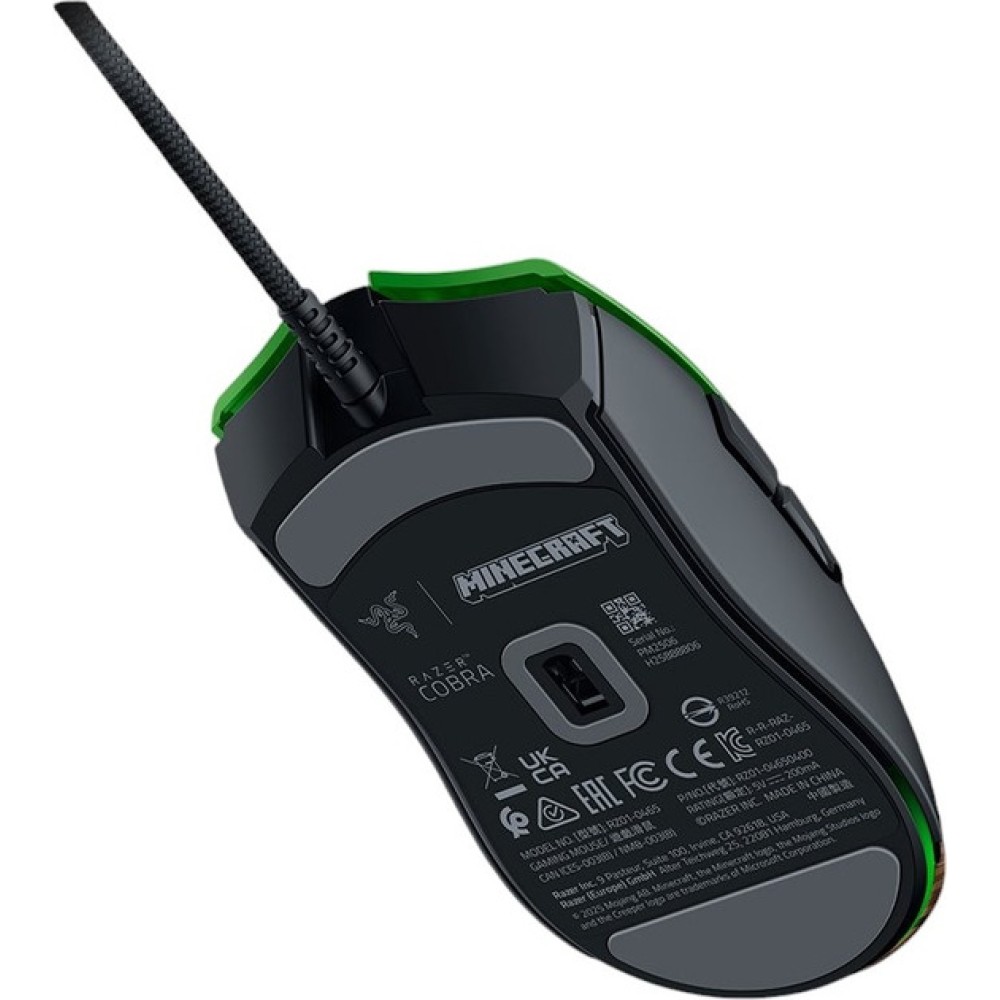 Игровая мышь Razer из серии Cobra, модель RZ01-04650200-R3M1, с симметричным дизайном для правшей, в зелёно-чёрном цвете с уникальным рисунком. Оснащена оптическим сенсором Razer с разрешением до 8500 DPI и шагом настройки 50 DPI, скоростью 300 IPS и ускорением 35G. Включает 6 программируемых кнопок, оптические переключатели 3-го поколения с ресурсом 90 миллионов нажатий, скользящие ножки из 100% PTFE и поддержку одного профиля во встроенной памяти. Оснащена подсветкой Razer Chroma RGB, проводным подключением USB с кабелем Razer Speedflex длиной 1.8 метра. Начальный вес — 58 г. Размеры: 119.6×62.5×38.1 мм. Совместима с Windows. Гарантия — 2 года от Razer.