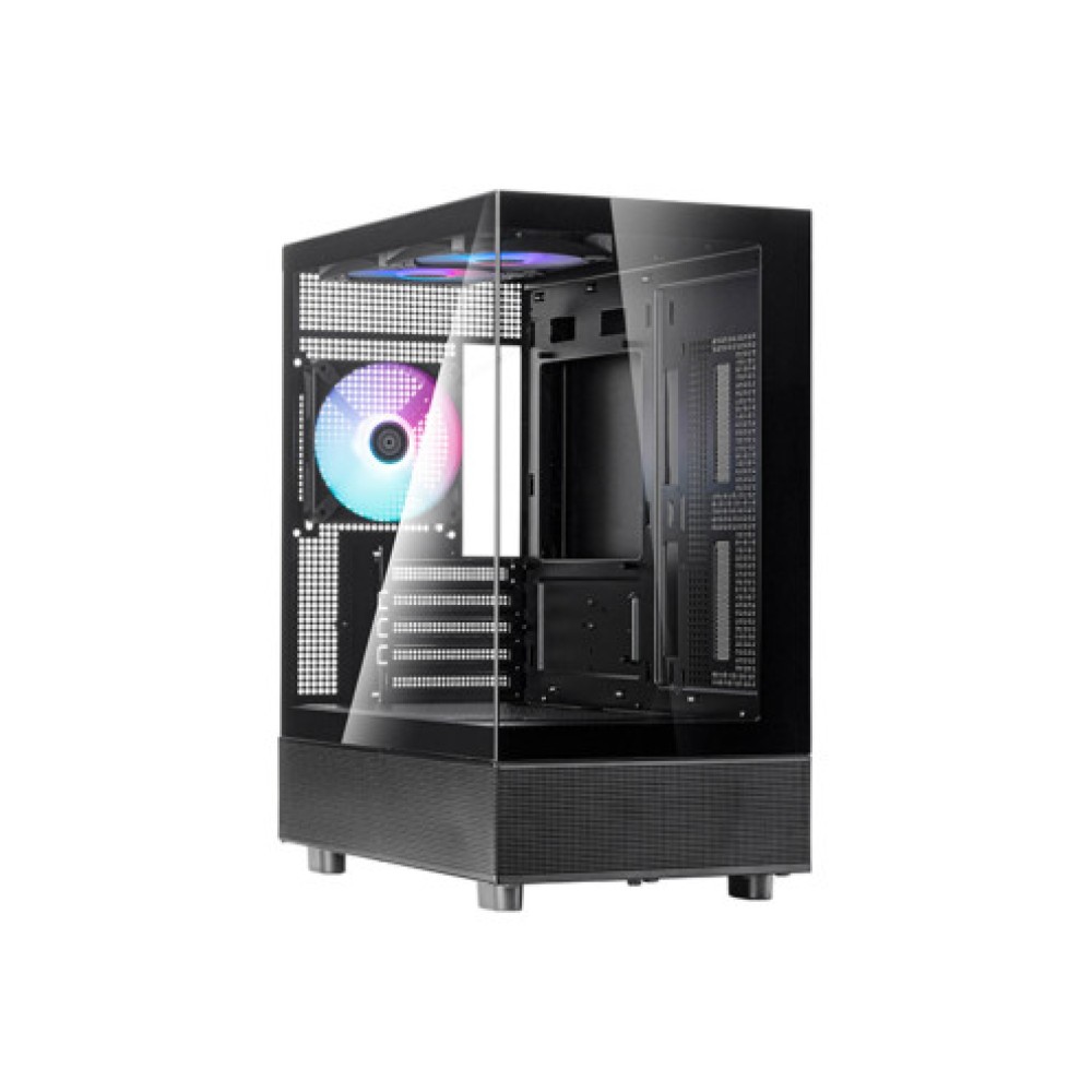 Корпус Mini Tower черного цвета, поддерживающий материнские платы формата Micro ATX и Mini ITX. Размеры корпуса составляют 230 мм в ширину, 456 мм в высоту и 365 мм в глубину. Корпус оснащен передними выходами USB 3.0, разъемом для наушников/микрофона и USB Type-C, что обеспечивает удобство в повседневном использовании. Подсветка ARGB добавляет впечатляющие визуальные эффекты, в то время как термический дизайн включает три вентилятора размером 120 мм. Корпус поддерживает установку двух жестких дисков размером 3.5 дюйма и одного диска размером 2.5 дюйма. Максимальная высота охлаждения для процессора составляет 175 мм, что обеспечивает гибкость в выборе компонентов охлаждения.