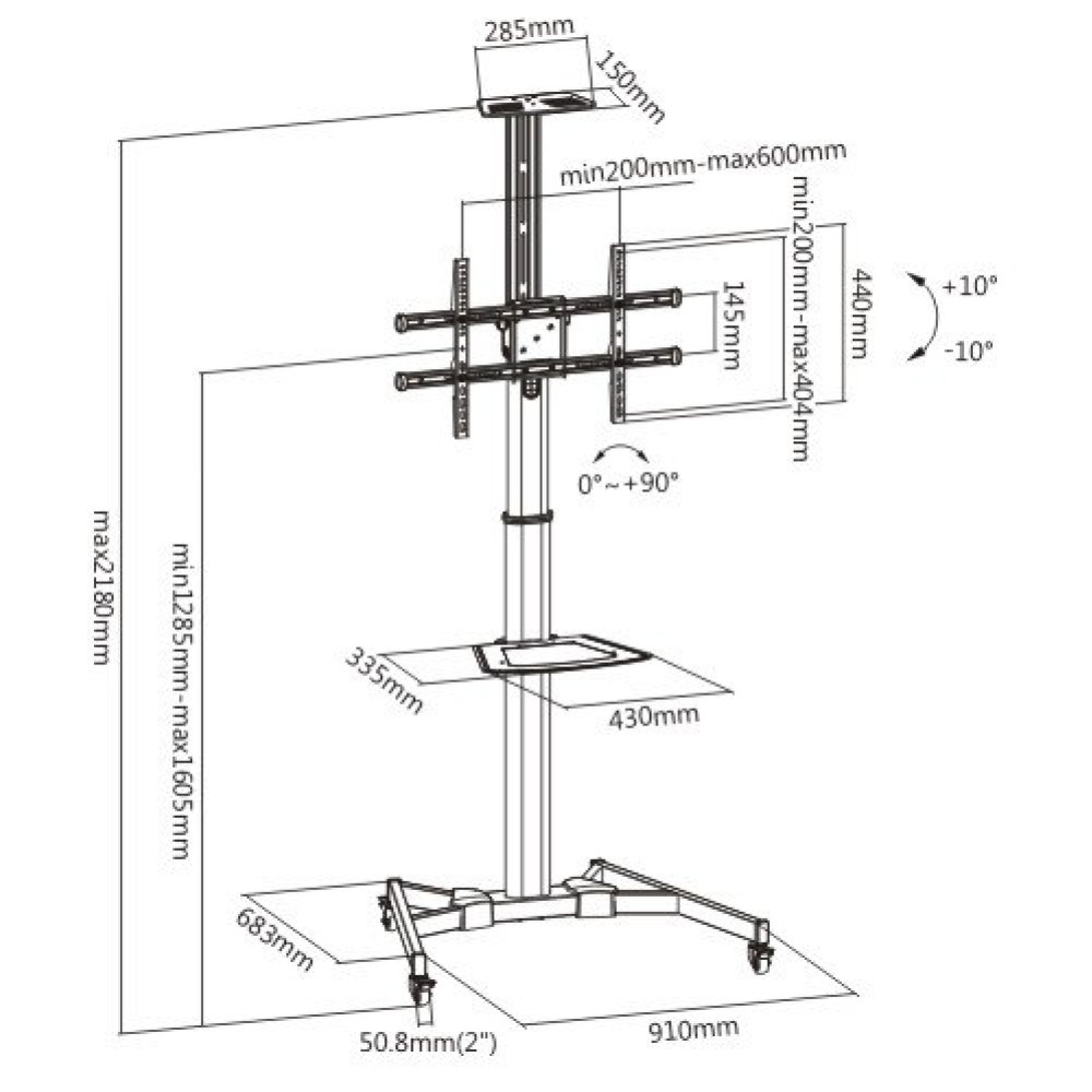 | מידות910x683x2180 מ"מ | משקל נשיאת טלוויזיה50 ק"ג (110lbs) | חומרSteel, Plastic |
